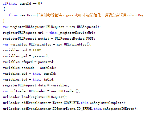 第二种方法就比较高端了,直接提取swf文件,然后反编译看源代码。但是代码往往都比较多,很难精确定位。而且实际操作中发现那as文件是一环套一环的……不过最终能找到注册的请求代码,以及验证码的请求代码。在代码中能很清楚的看到那些参数的来源和含义(gid是游戏id,tad一直是"none")。
